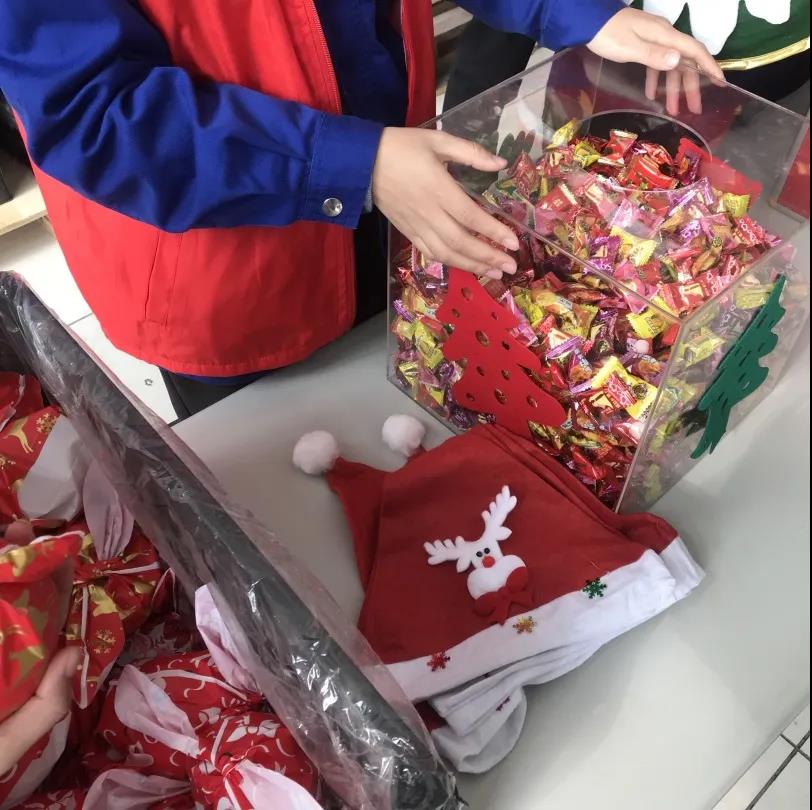 中午在员工餐厅内,,,,,,,,抽奖箱内“平安夜快乐”、“圣诞快乐”、“糖果甜一甜”三种差别的抽奖券划分是平安果、糖果以及圣诞帽三种奖品。。。。。